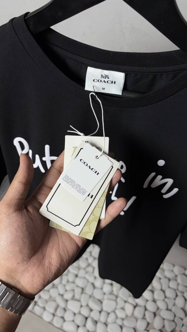 Make a confident style statement with the Coach ?Put Me In, Coach!? Graphic T-Shirt in classic black. Designed with a bold handwritten-style slogan across the front, this tee blends playful attitude with Coach?s premium fashion identity.